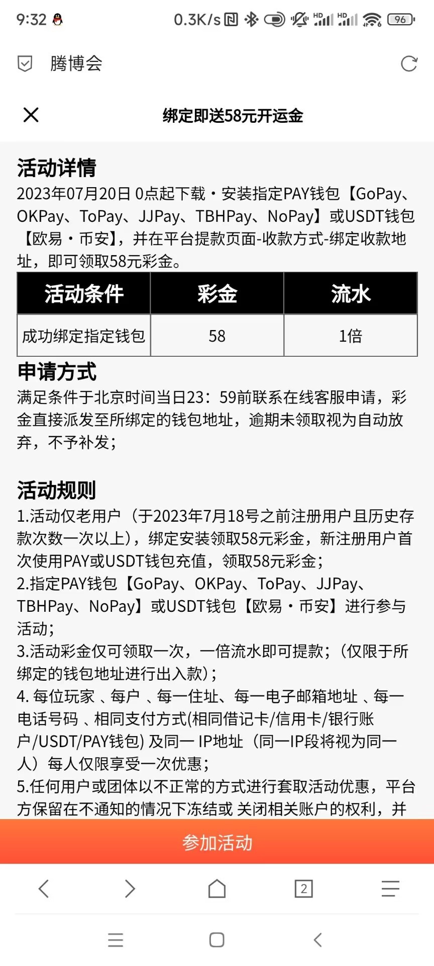 腾博会7月15号之前有过任意充值(首存不算)绑定任意钱包送58,送的58直接到钱包,可以直接卖