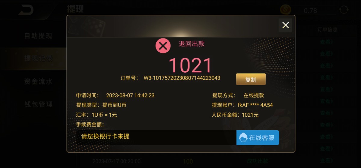 200上1000,提款不让提虚拟币,ok什么都不可以,必须提卡,老号不是第一次。退回后300提卡说风控让全额提。摆明想p图空汇(已经出现过一次这个情况,原汁原味的套路),想出的话300不会退回的。就是想黑。