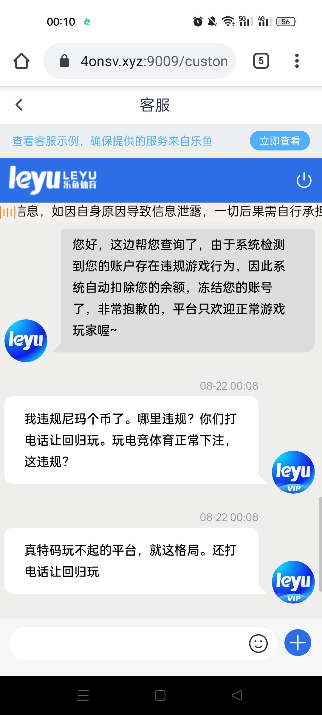 乐鱼大黑台,杂碎狗代理打电话让回归,送了58,打到1000,取100直接封,正常投注买了几场体育,就违规。这个杂种台没格局