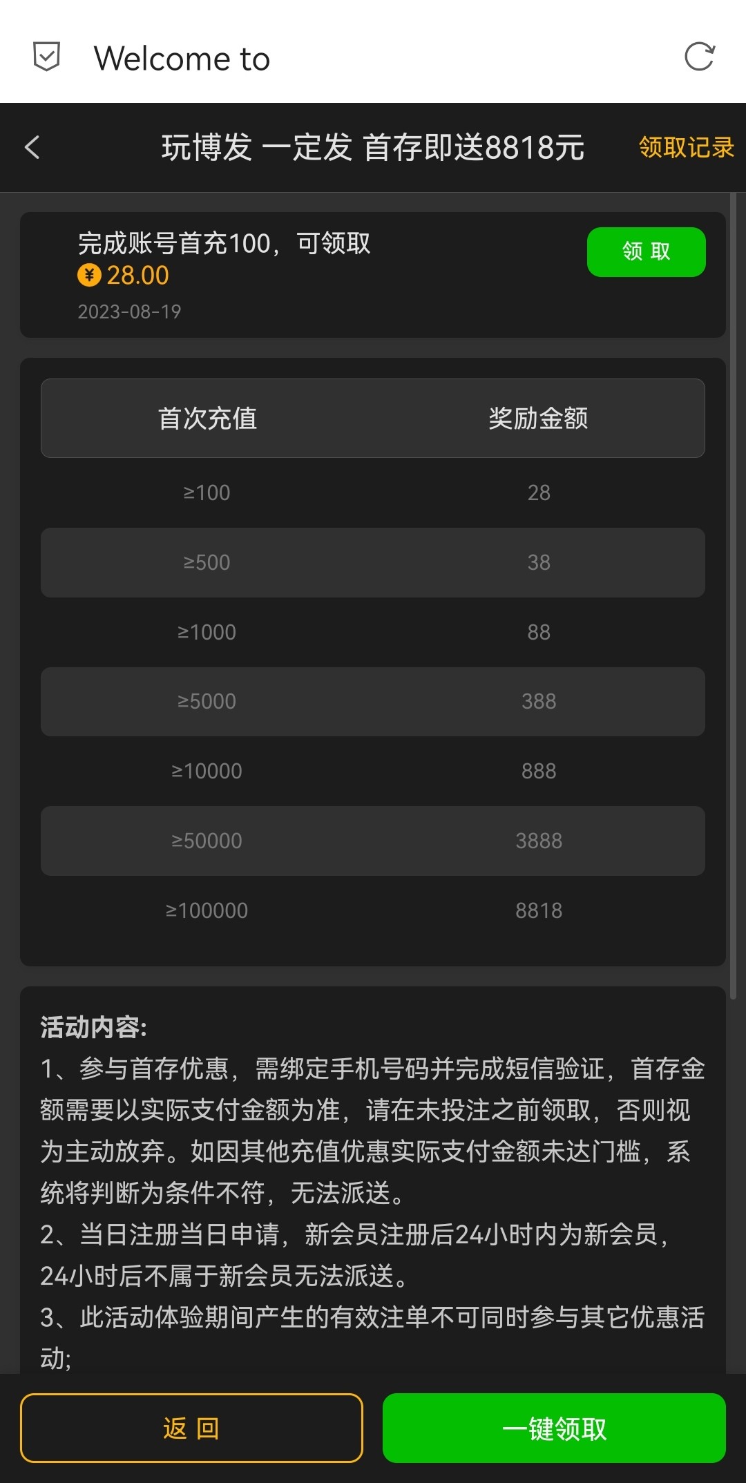 老哥们这个回馈28彩金的不是看你们历史存款的是看你们以前刚注册第一次首存的100的金额来送的