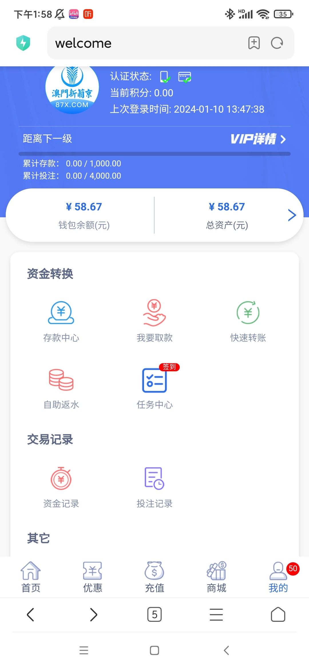 送58,三倍水,原先注册过的也送,我去年注册过,没充值,电话特邀