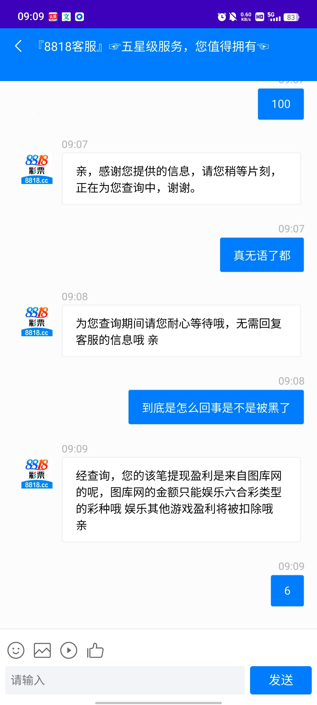 开始打上100了申请提款给我把钱扣完了只退了开始没赢的钱说我不能玩其他的只能玩六合彩所以赢的不算,然后我拿着40去打六合彩又打上一百又给我拒绝出款说我违规投注就是把我黑了