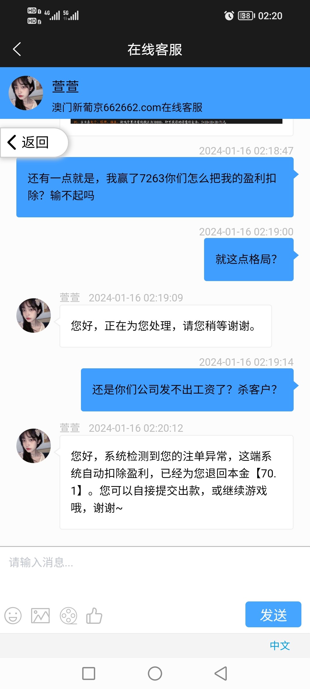 2024年1月15号充值701打到7964提款被清空盈利,退回本金。太恶心了