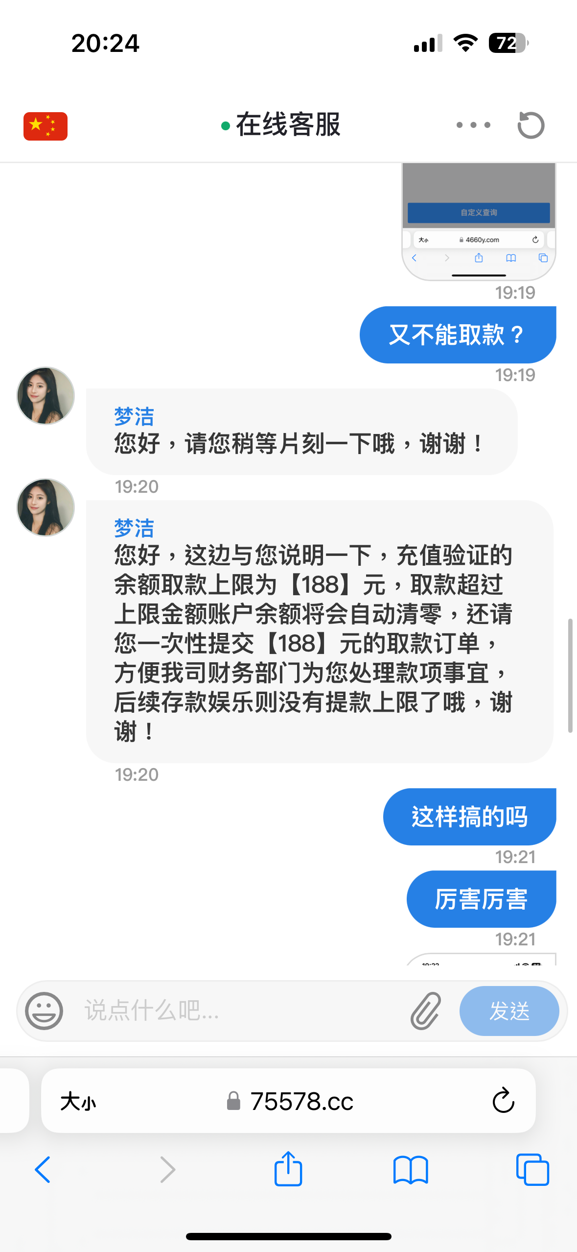 刚开始签到9块打水500提现退回 客服说充值100才能提现 充值了100提现500又全部扣剩下183 说只能提183 好嘛提183就183 没过一会充50打上350提现两百又被退回 结果又说要充值350加上账号上的350打3倍水 这尼玛真没格局 真的出生平台