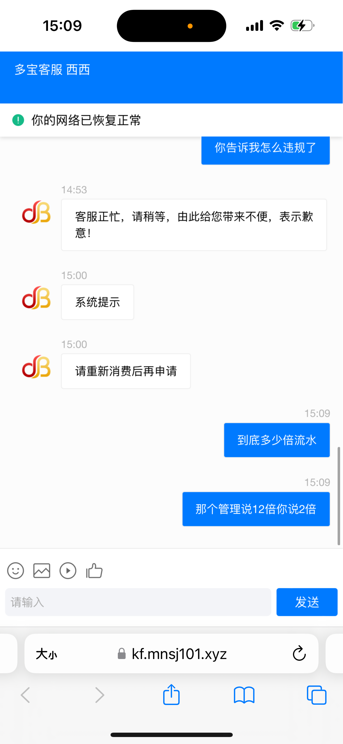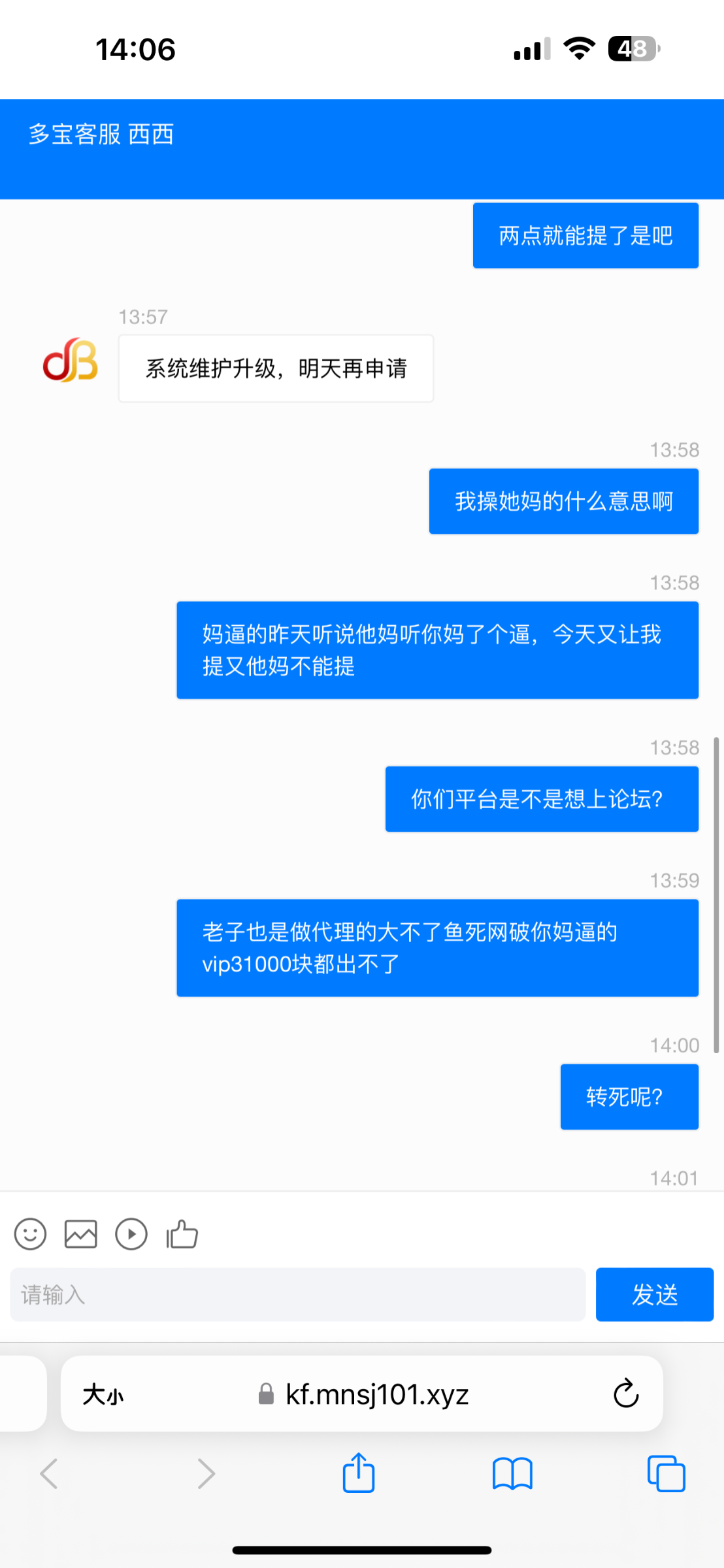 曝光死妈多宝平台一开始1000➕1000 12杯水打出来了上6000不给提说违规投注妈的逼的他自己活动限制就是真人电子我全程在打这两个说我违规投注他妈逼干脆别玩了 还你妈逼违规一投注就违规你司马平台还有人玩,然后昨天说了半天又退本还让他一杯水好,我打了麻痹又提款上限平常一天之前提3次都没事 找客服又说要下午2点明天财务没上班你个死妈平台开不起了?半夜没人上班傻逼平台那个平台不是24小时提款操你妈逼今天又说系统维护你妈了个懒丑逼的 多宝你们别想好过 之前是名爵也是个司马台 多宝体育谁玩谁傻逼