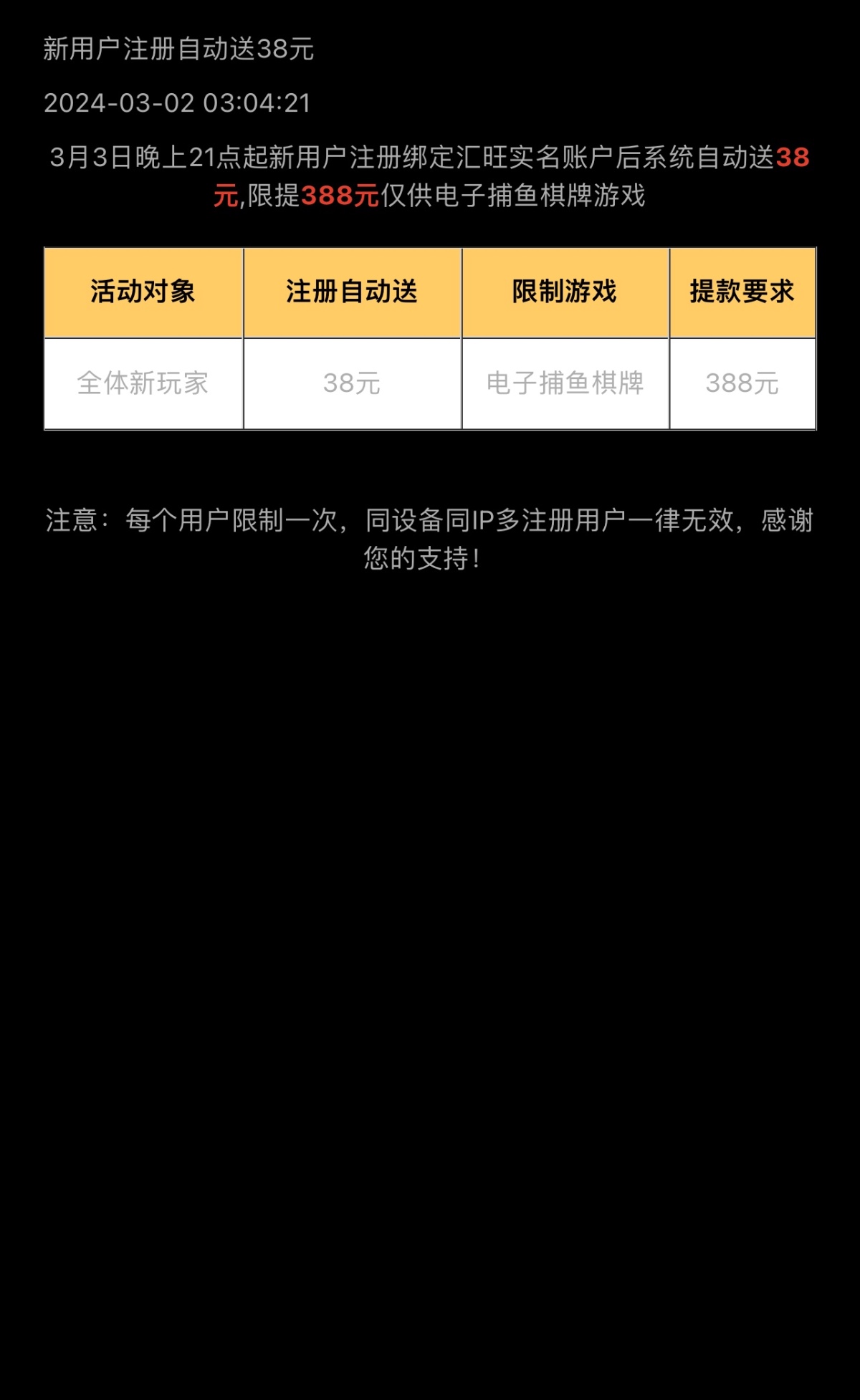 新用户注册实名绑定汇旺,系统自动派送38