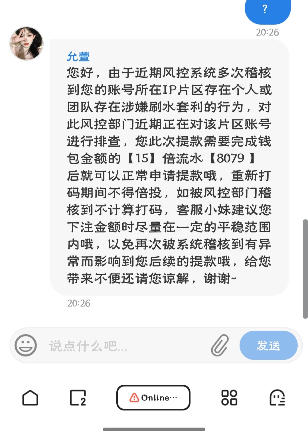 现在这些台有点幽默 想黑你又怕你去发贴发群里说它们黑 今年两个月不到就遇到三四个这种又当又立的罚水台了 没违规让你去打十几倍流水打到输光为止这样就不算黑你了