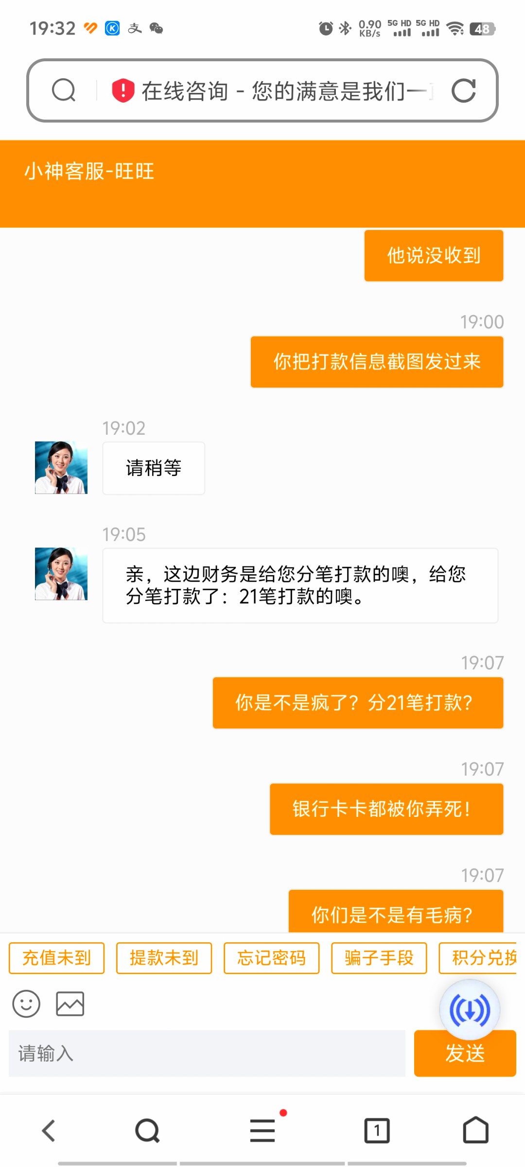 他妈的,捡到一个打火机,上面有76c送89彩金的广告,然后就注册了绑定了卡商的卡号领到了第一笔彩金47,然后打麻将胡了爆了330,提款了,显示已汇出了,接着就去领了第二笔42彩金,又打到了185元,又提了!最后找了卡商报单,等了半天,卡商说接不了,说是分了21笔,小额转过去他的卡里的,说他的卡要死了,不给我结账,他妈的一起收到了500,一分钱不给我结,白干!这个76c他妈的,傻逼吗?为什么要分21笔打款???搞别人卡玩的?