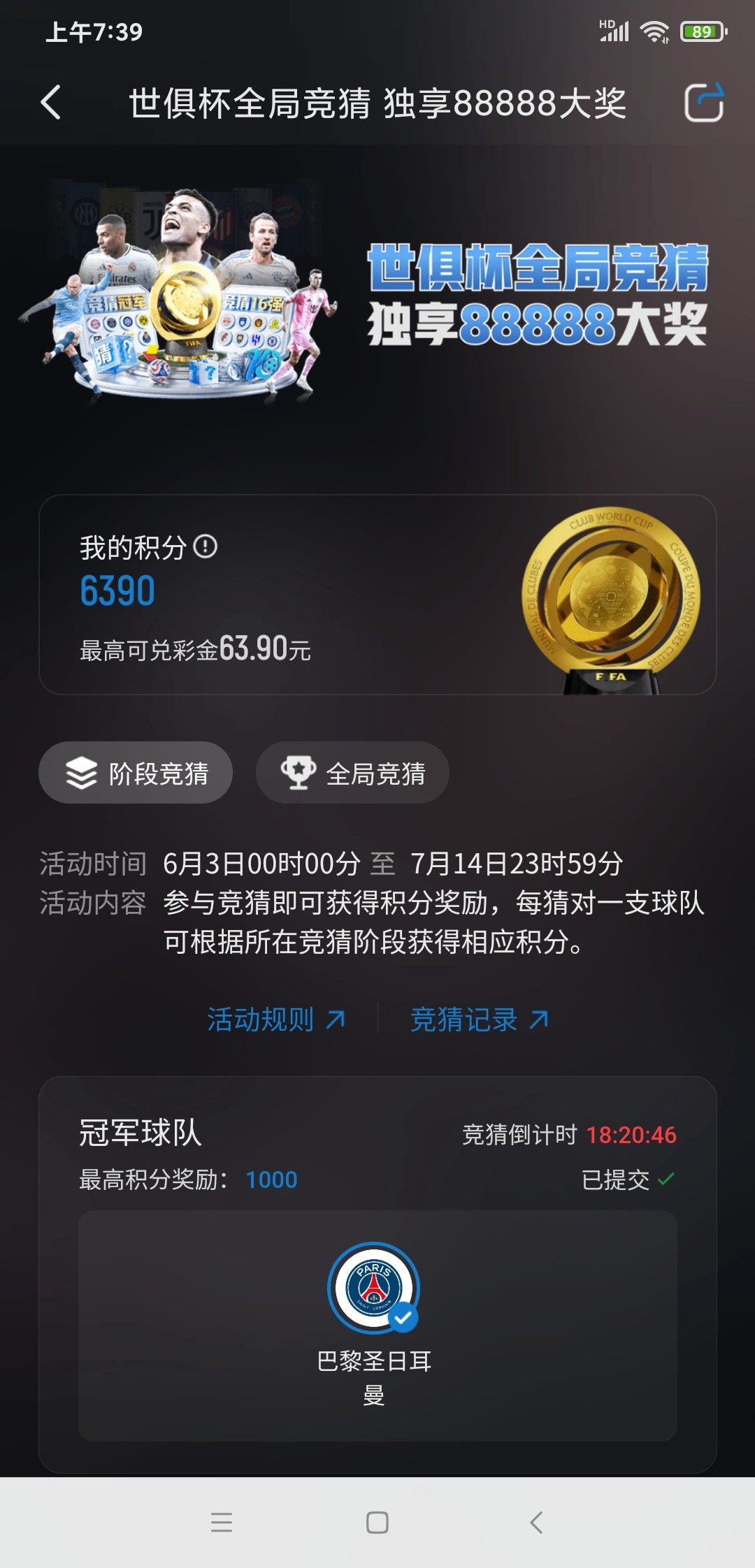 决赛猜冠军拿积分,不是A就是B,不一样的台子对压一个总能中。14号踢完了决赛48小时内结算100:1自动兑换成彩金发到福利中心。