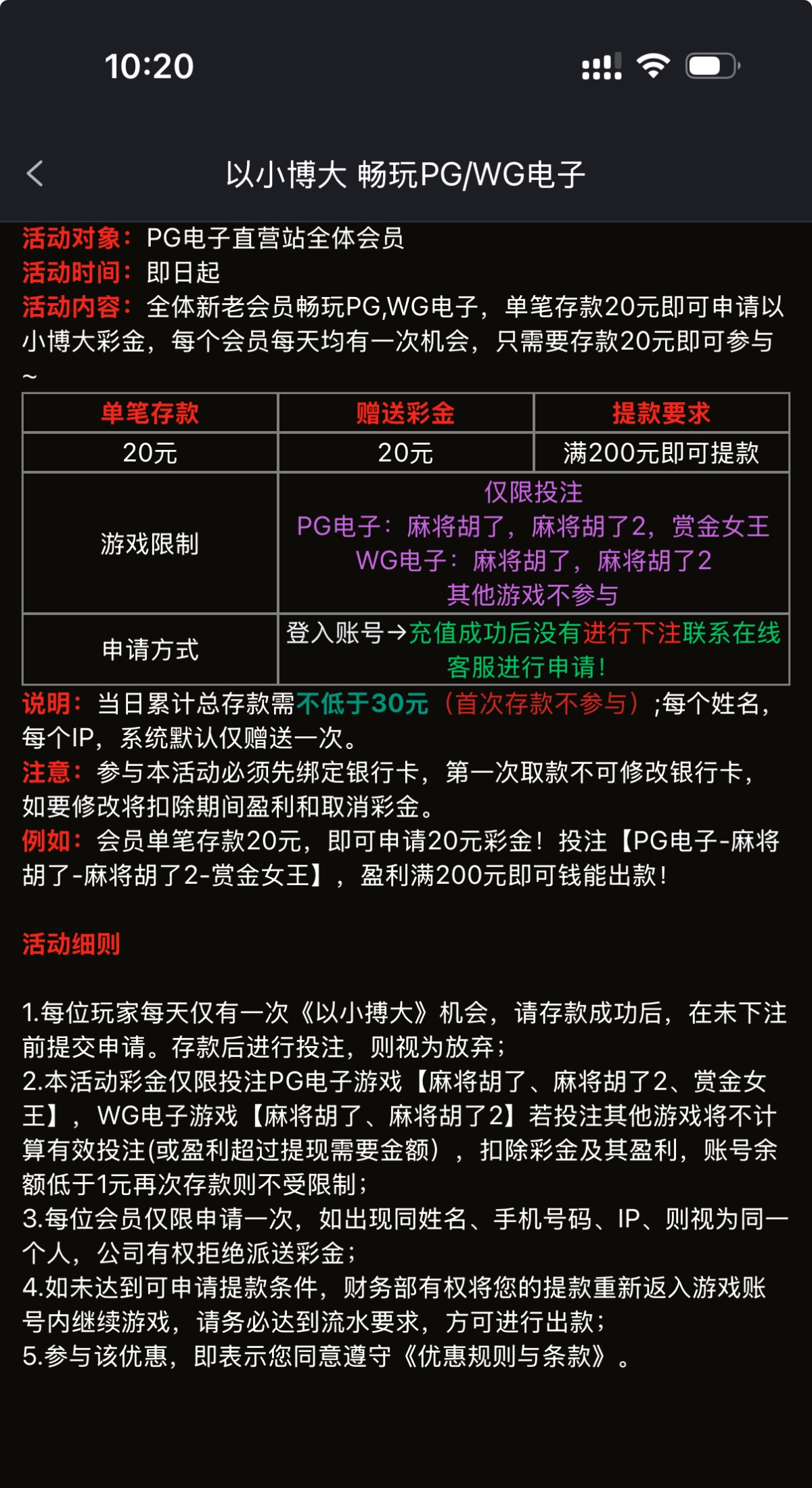 全体新老会员畅玩PG,WG电子,单笔存款20元即可申请以小博大彩金,每个会员每天均有一次机会,只需要存款20元即可参与~可以试试 我提现到账200