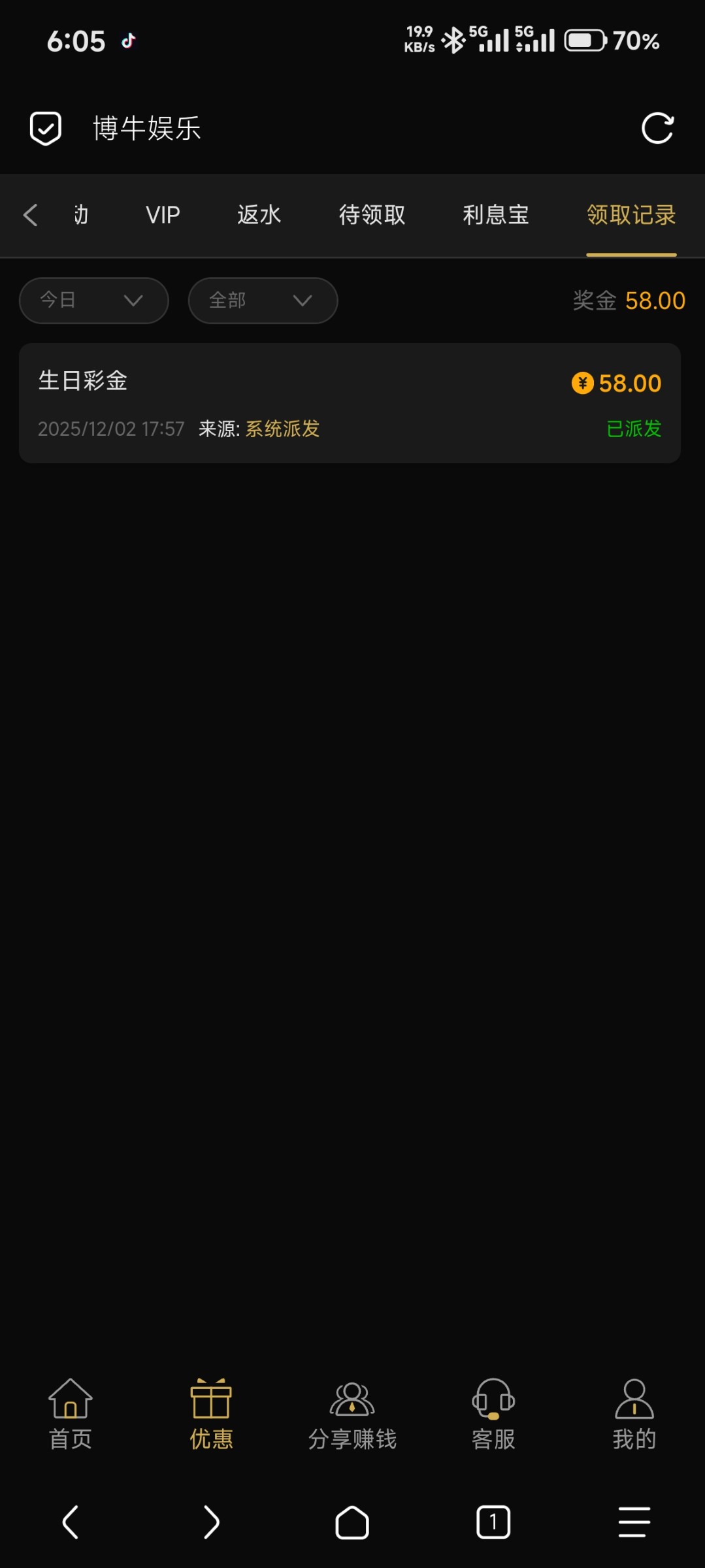 博牛p图58生日彩金得吃300,铁汁有vip的可以试试