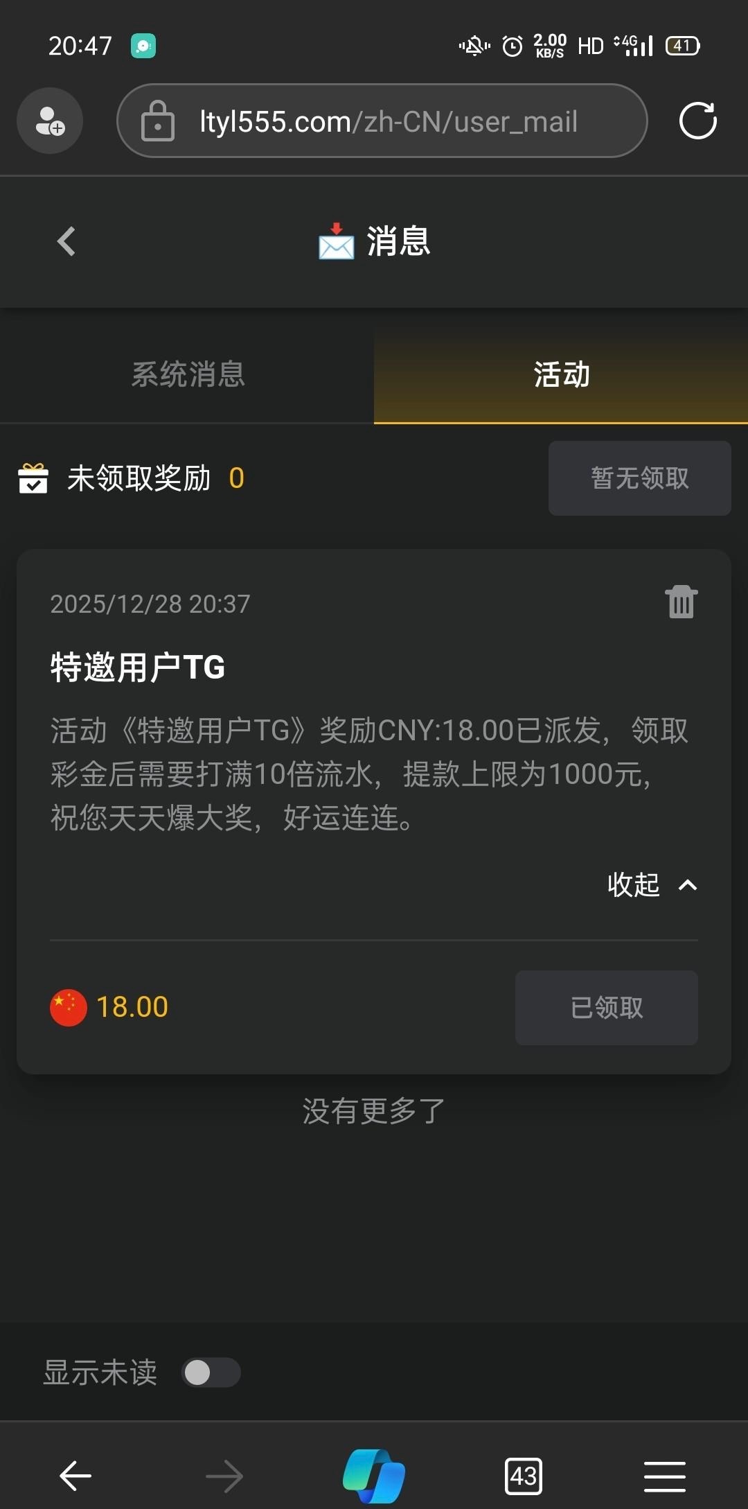 之前有老哥发过,但是要人工审核的吧,现在这个注册绑定好飞机,五分钟内到了,我没打出来。出款自测,出款的老哥发个图。网址ltyl555.com