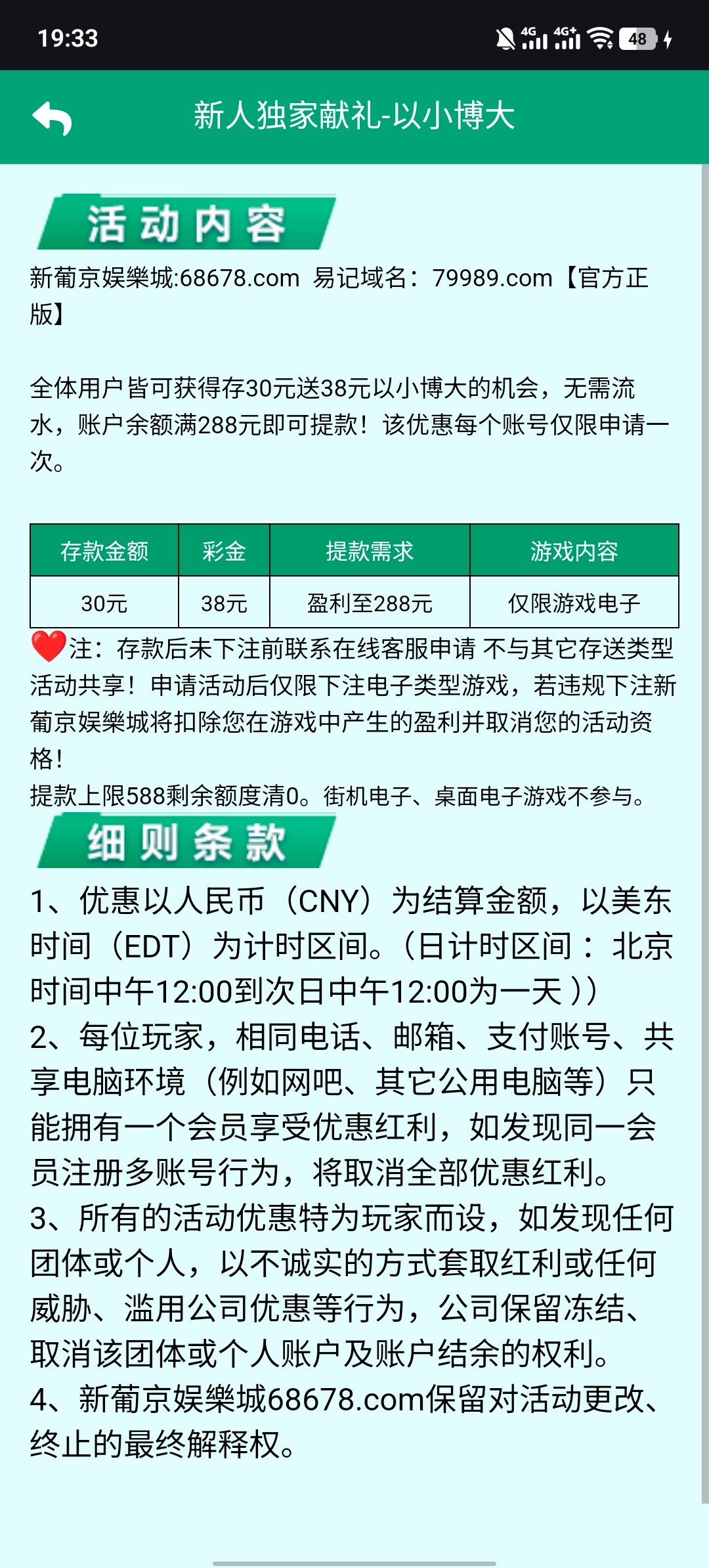 全体用户皆可获得存30元送38元以小博大的机会,无需流水,账户余额满288元即可提款!该优惠每个账号仅限申请一次 。只能玩电子类  30+38  盈利至288元提