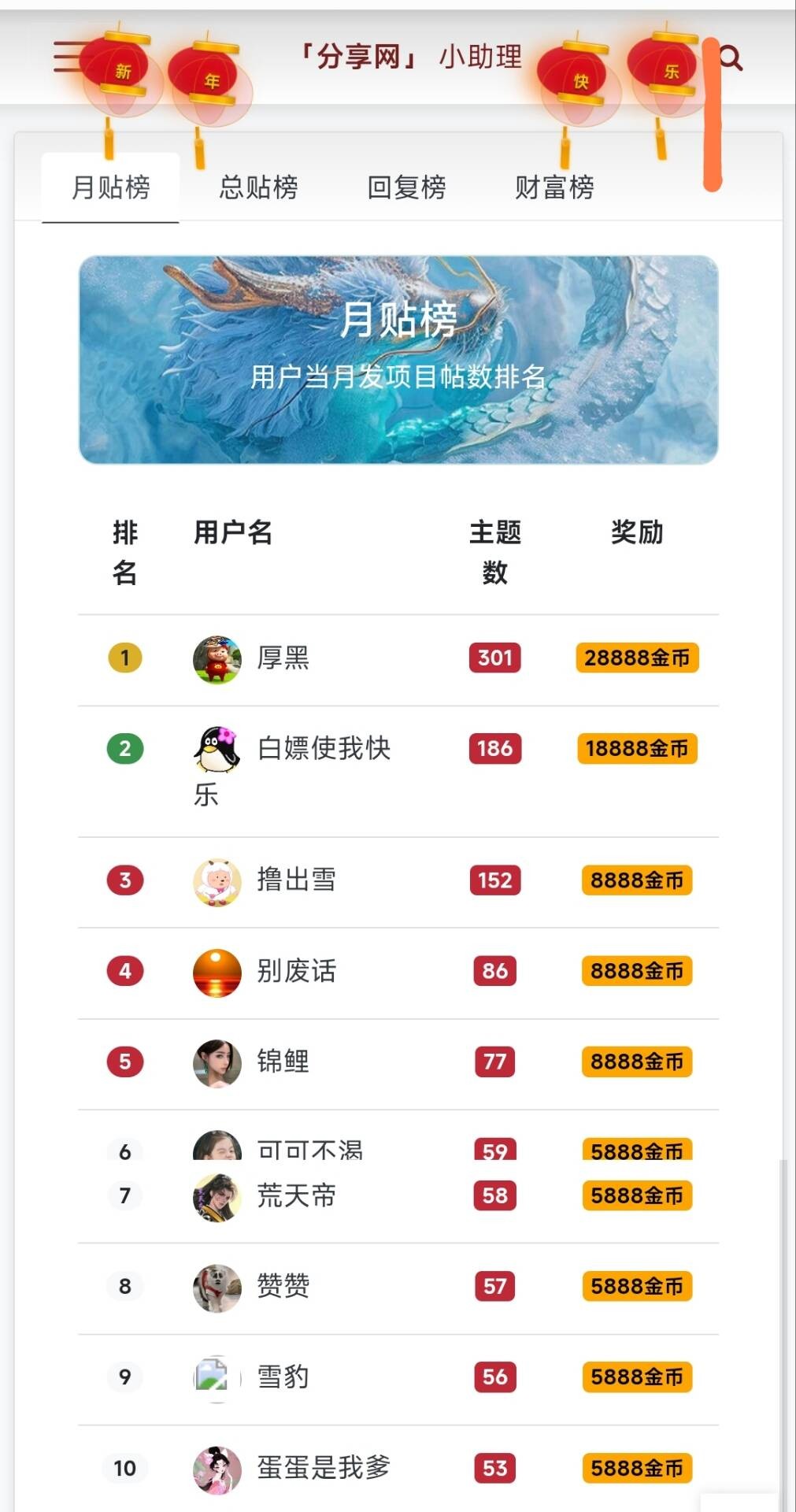 继续沿用“发帖数量前十名”获得金币奖励。优点:规则简单,多劳多得。