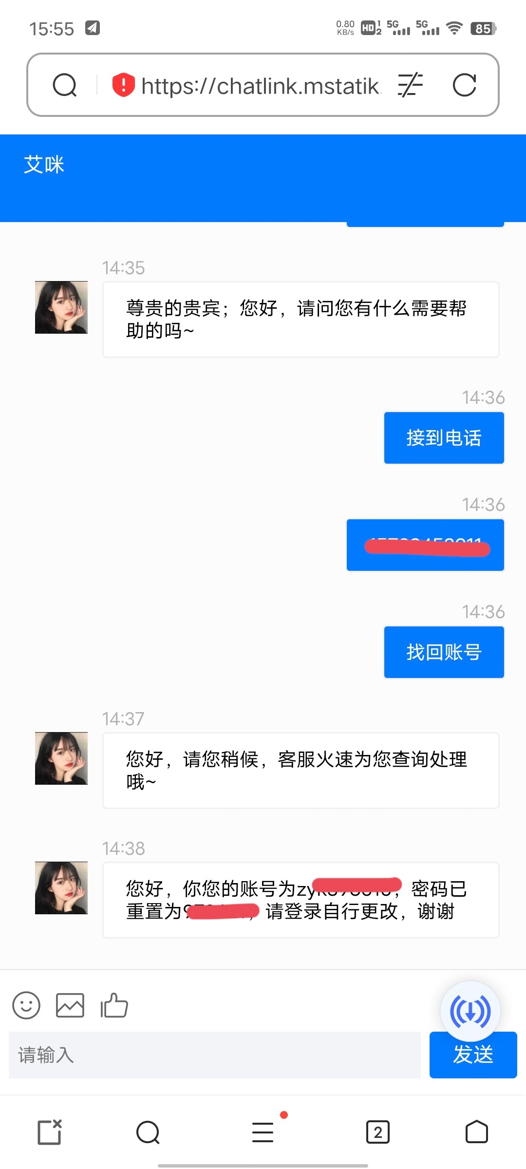 我笑了,看我跟客服说得,直接给她发手机号啊