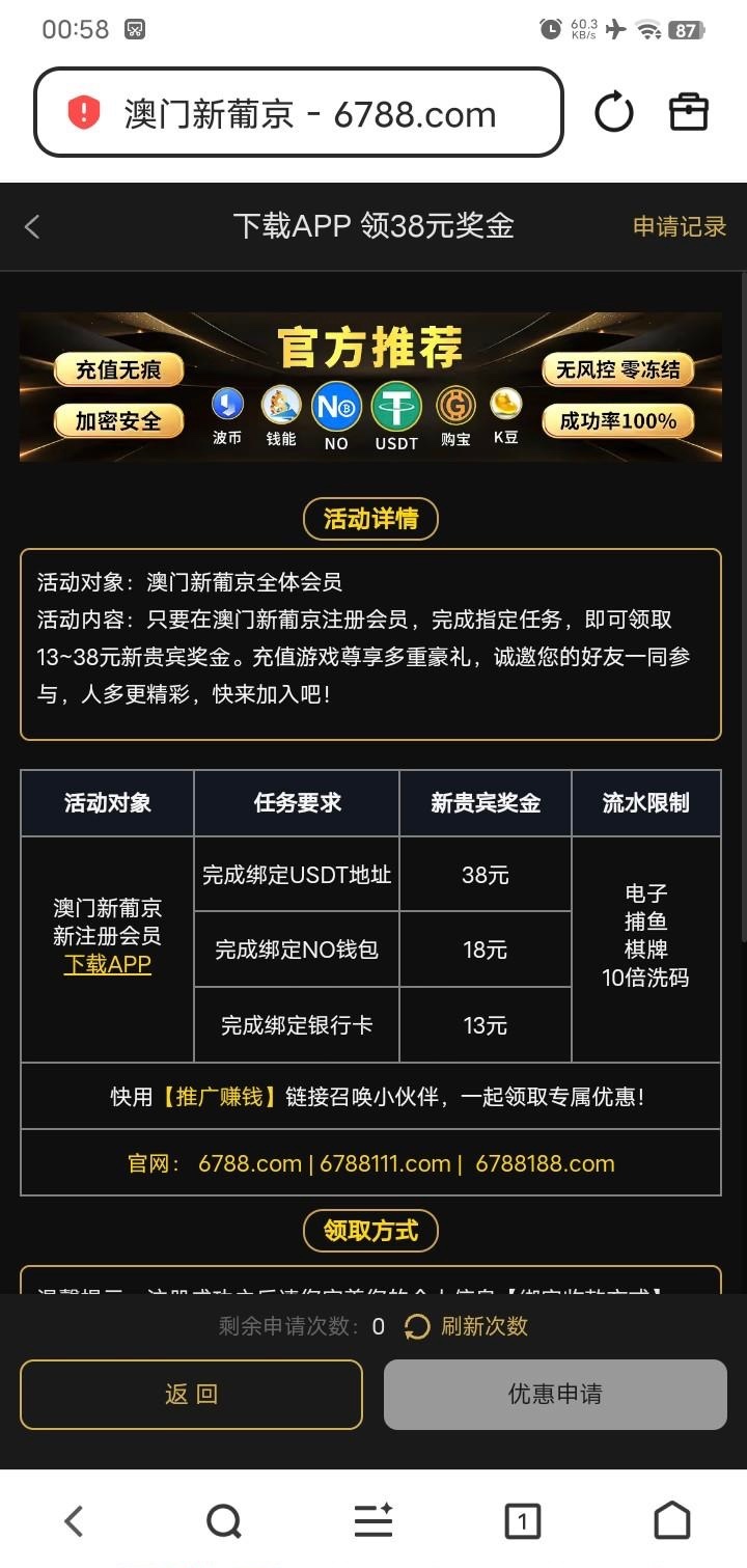 先下载app在注册,绑定u送38,绑定N0钱包送18绑定银行卡送13只能绑定一个,6788.com,还有特邀彩金可以领