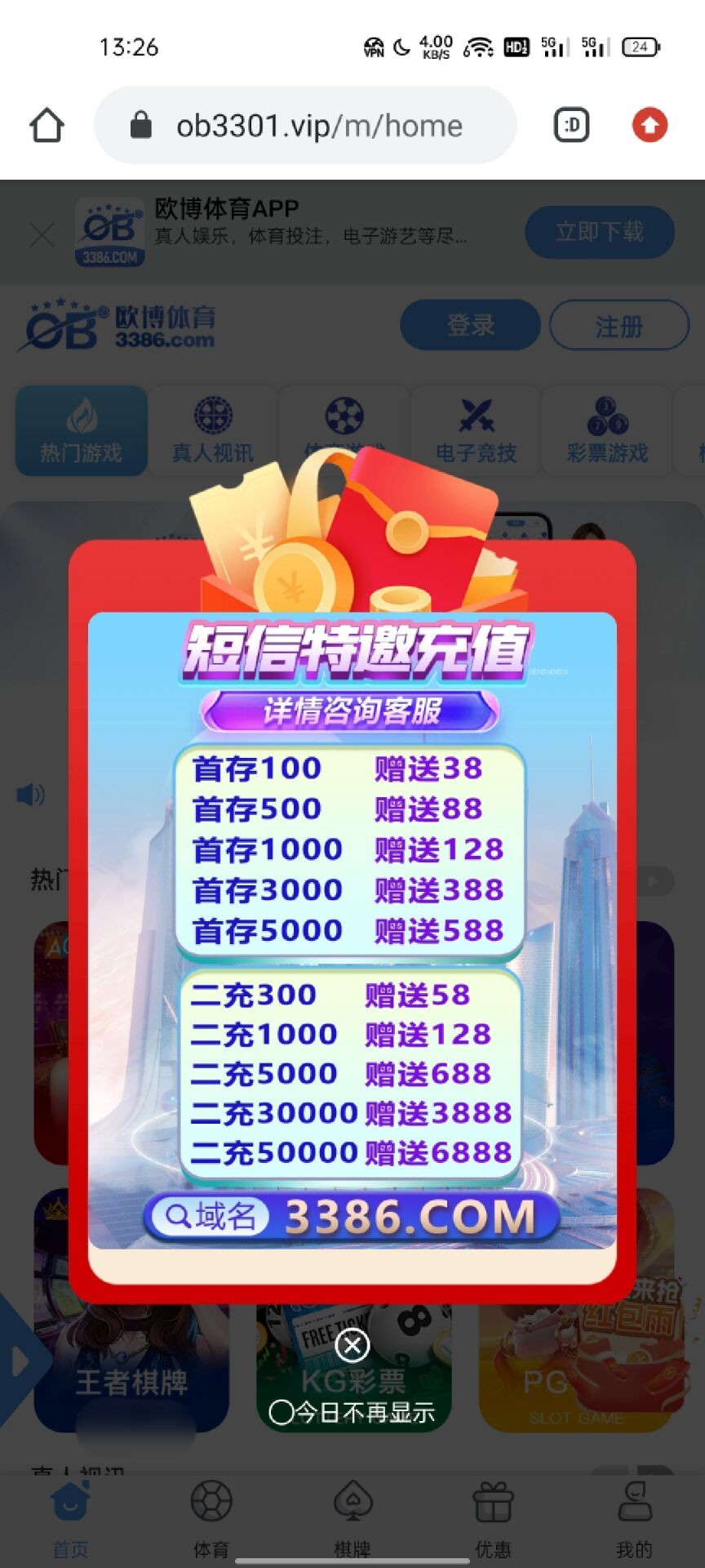 短信特邀100+38打上500,提现后直接封号然后问客服说注单异常无限审核。